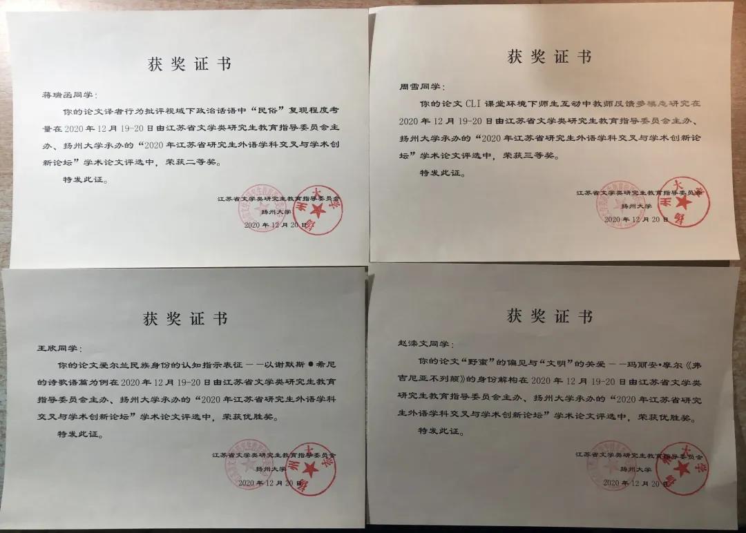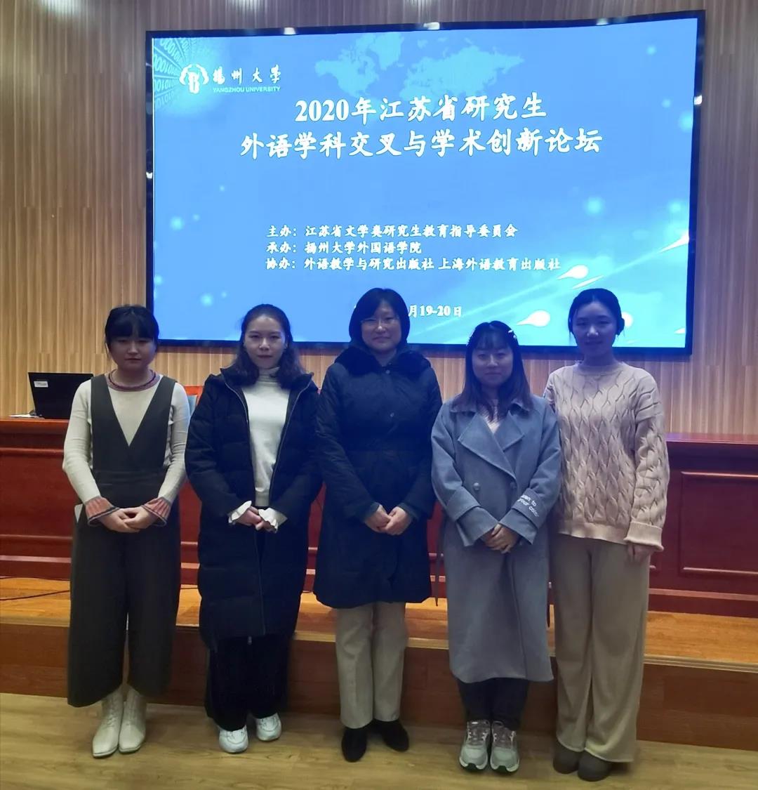 2020年12月19—20日,来自江苏、安徽、辽宁三省共25所高校近百名外国语言文学学科博士、硕士研究生相聚扬州,参加2020年度江苏省研究生外语学科交叉与学术创新论坛。本次论坛由江苏省文学类研究生教育指导委员会主办,扬州大学外国语学院承办。在研究生教研室主任林璐教授带领下,我院2018级研究生赵滦文、2019级研究生蒋瑞函、王欣、周雪参加了此次论坛。论坛上,四位同学围绕当下前沿主题精彩发言,现场表现受到点评专家的高度认可,最终获得二、三等奖各一项,优秀奖两项。