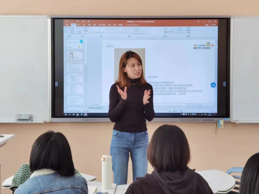 接着,于金铭老师对大连市童正学府亲子俱乐部活动项目进行了介绍和说明。最后,赵月老师通过一则视频向同学们讲述了英语学习培训的上课流程以及教学方法等,并向同学们说明了岗前培训和实习时间分配等相关事项。赵老师表示,期待早日与我院同学们一起合作交流。