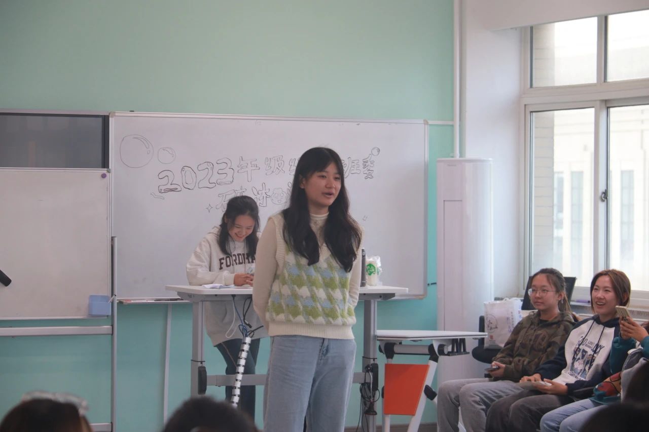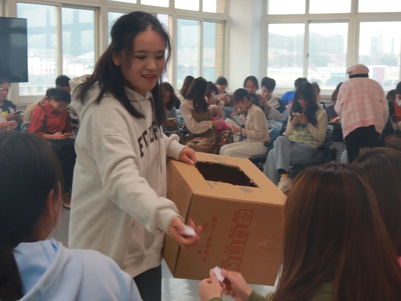 开场前,同学们将写给同级小伙伴的卡片放入纸箱中。活动开始后,主持人带领大家进行击鼓传花。随着拍手声的逐渐急促,小南瓜灯在大家手中起起落落,现场欢呼声、呐喊声连成一片。最终被传到的人上台做自我介绍并推荐家乡景点与美食。三轮过后,现场气氛活跃,语笑欢喧。