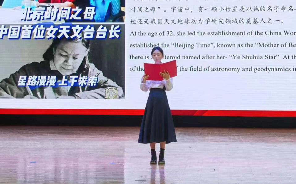 中场表演环节中,由蒋美轩、李昕睿、张依然、汪思齐、许博雅五位同学带来的朗诵《中华儿女多奇志,巾帼风华满庭芳》讲述了韦慧晓、邓迎香、叶嘉莹、张桂梅、叶叔华五个人物的感人事迹,向在各个领域为祖国无私奉献的中华巾帼致以最崇高的敬意。