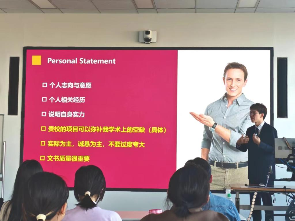 在国外留学方面,成功申请至香港城市大学的范乐文同学进行了留学申请经验分享。他详细介绍了自己的择校策略,全面阐述了申请前、中、后各个阶段所需的准备工作及注意事项,并特别强调在制定选校方案时,应综合考虑个人能力和未来就业规划。在简历撰写方面,他建议同学们关注核心课程、突出语言成绩并展现实习经历。此外,他还为同学们提供了关于个人陈述和推荐信撰写的宝贵建议。