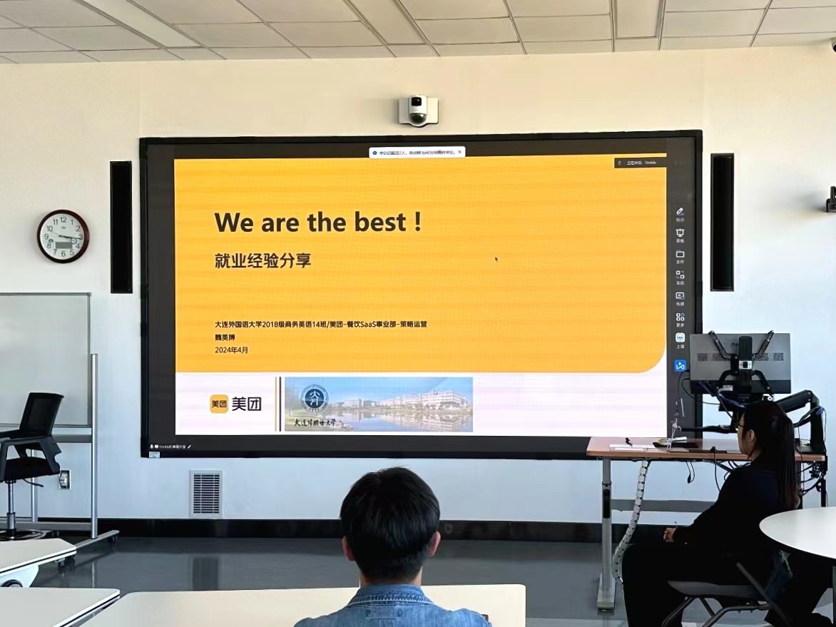 首先由两位往届毕业生通过线上的方式分享其就业与考研经历。商务英语2022届毕业生魏英博同学根据自己在美团(成都)公司的求职与就职经历,从工作感受及求职经验两个方面进行了分享。他以“尝试、比较自己、快速”为关键词,总结了自己在工作中的体会,凸显了勇于尝试、自我认知与高效工作的重要性。此外,他指出简历在求职过程中的关键作用,并详细介绍了优化简历的技巧与方法。他还为同学们提供了面试和笔试的应对策略,从准备到应对,都给出了具体可行的建议。