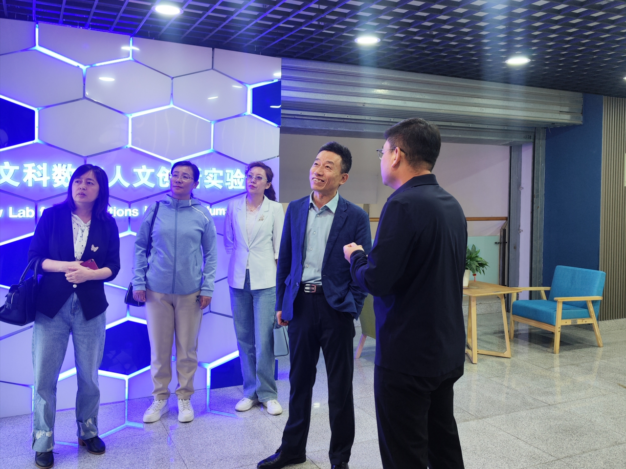 ,开展英语专业建设、本科课程建设、人才培养方案等方面的调研。王少杰院长一行参观了校园,观摩了《综合英语(世界文学作品)》《中国文化》和《英国历史文化》3门课程,实地调研了智慧教室、英语VR实训中心、新文科数字人文创新实验室。
