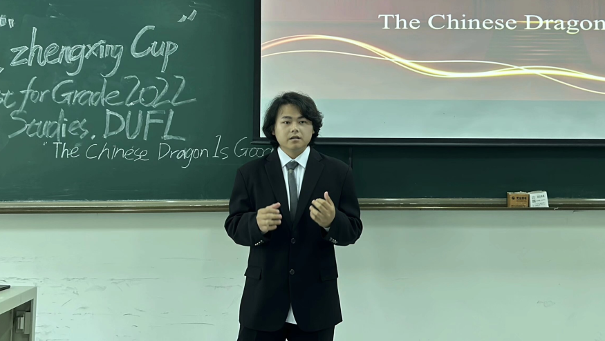 参赛选手们纷纷化身为中国故事的讲述者,或以宏大的历史视角描绘中国龙如何引领民族穿越风雨、屹立世界之林;或从细微处着眼,讲述龙文化在日常生活的点滴体现,以及它如何激励着中国人民在现代化道路上不懈追求。话语间既有对中国现代化成就的自豪颂扬,也不乏对挑战与机遇的深刻剖析。他们生动的比喻和形象的描绘将“中国龙”这一古老而又永恒的符号栩栩如生地展示了出来,展现了英院学子对中国未来的美好憧憬和责任担当。