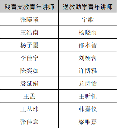 经过对志愿者教学能力的评定,根据评委面试评分结果,最终选取残青支教和送教助学青年讲师各9人,共18位讲师入选,他们将共同组成一支充满活力与担当的残疾青年支教队伍,在志愿服务中展现青春风采,贡献自身价值。以下是志愿讲师入选名单: