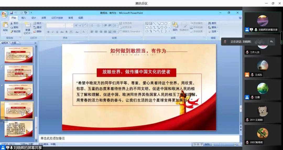 首先,吕院长引用2017年十九大通过的《中国共产党 章程(修正案)》将推动构建人类命运共同体这一思想写入党章的内容,阐述了人类命运共同体思想的重要性。接着,院长列举了人类命运共同体意识在文学作品中的体现,以及,在疫情期间的展现。随后,针对什么是人类命运共同体,为什么要建构人类命运共同体,如何建构人类命运共同体等问题进行了详细讲解,帮助同学们深刻理解了这一思想的实质、意义与作用。最后,吕院长以一段话语寄予全体入党积极分子:在守望相助中寻求合作;在互利共赢中实现繁荣;在交流互鉴中延续文明;在同舟共济中开创未来。并希望同学们深刻理解其内涵的同时,放眼世界,站在人类命运的宏大视野和框架布局下审视我党。作为世界最伟大的政党,中国共产党所赋予自身的崇高历史责任和神圣的时代使命,以及为人类进步事业所奉献的崇高智慧,增添了我们对伟大的党,以及伟大的祖国更深厚的敬仰和热爱之情。