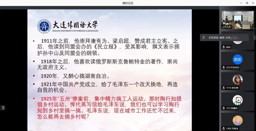 在第五讲的课堂上,王成东副院长以一篇博士论文的“致谢”作为开场,紧接着为同学们讲解了我国脱贫攻坚战的全面胜利以及扶贫路上的大外人。2021年为中国共产党建党100周年,值此之际,王成东副院长再次带领同学们一起回顾了党的光辉历史。