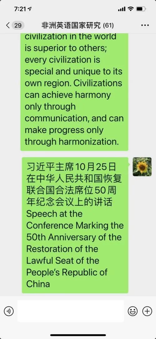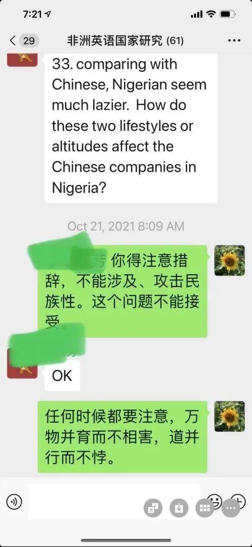 在教学内容中引入了国家领导人对于中非关系的重要论述和国家颁布的重要政策文件。如:布置学生阅读《习近平在2018年中非合作论坛北京峰会开幕式上的主旨讲话》(双语)、《北京峰会标志中非关系新的里程碑》(双语)、《王毅在中非合作论坛成立20周年纪念招待会上的讲话》(双语)、《习近平在中非团结抗疫特别峰会上的主旨讲话》(双语)等。注重培养学生为国家战略服务的学术精神,将非洲研究与中国“一带一路”战略、“人类命运共同体”理念、中国核心价值观认同、中国话语建构紧密结合,提升学生为国家建设服务的科研意识。同时,本课程还把思政内容潜移默化地应用到了具体问题的解决之中。如:当有的学生对其他民族的人有不恰当表述的时候,任课教师引用习近平总书记的表述来达到育人的效果。