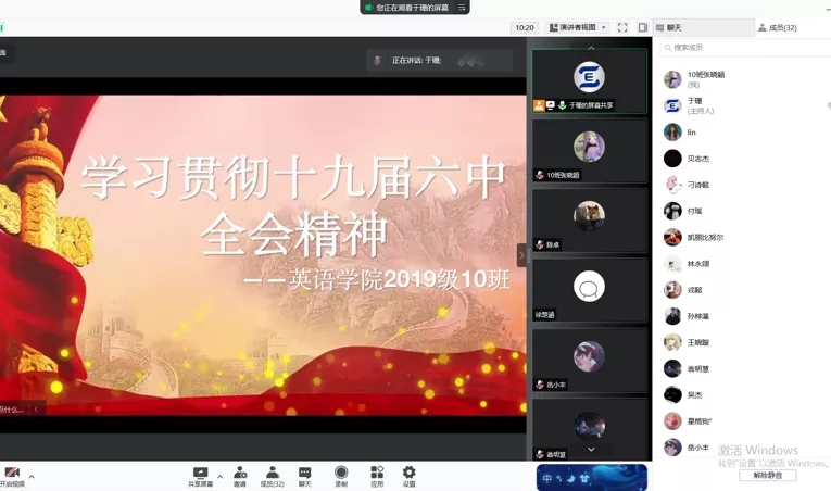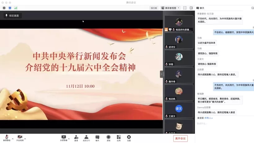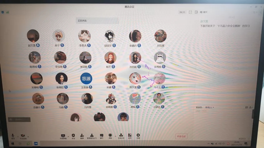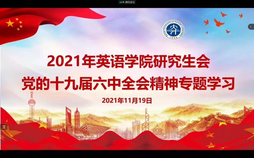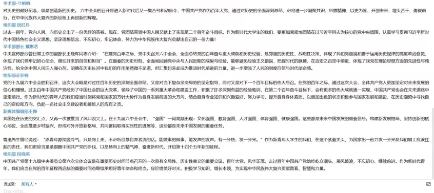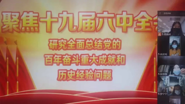 学生会、研究生会一体化,积极发挥学生骨干领学作用,在学习之后广泛发动所联系的同学在线上开展进一步学习。通过观看“党的十九届六中全会”视频,同学们积极讨论、学习、领会十九届六中全会精神。