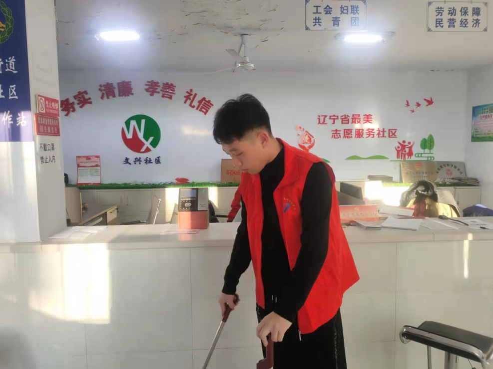 此次假期我来到了辽宁省葫芦岛市兴工街道文兴社区做志愿服务,主要负责社区的卫生工作,保障社区各服务区域的卫生清洁。社区是阻击疫情的重要防线,我希望通过自己的一份力量,让社区的工作人员们在辛苦的日子里,有更舒适,更整洁的工作环境,更好的守卫我们共同的家园。