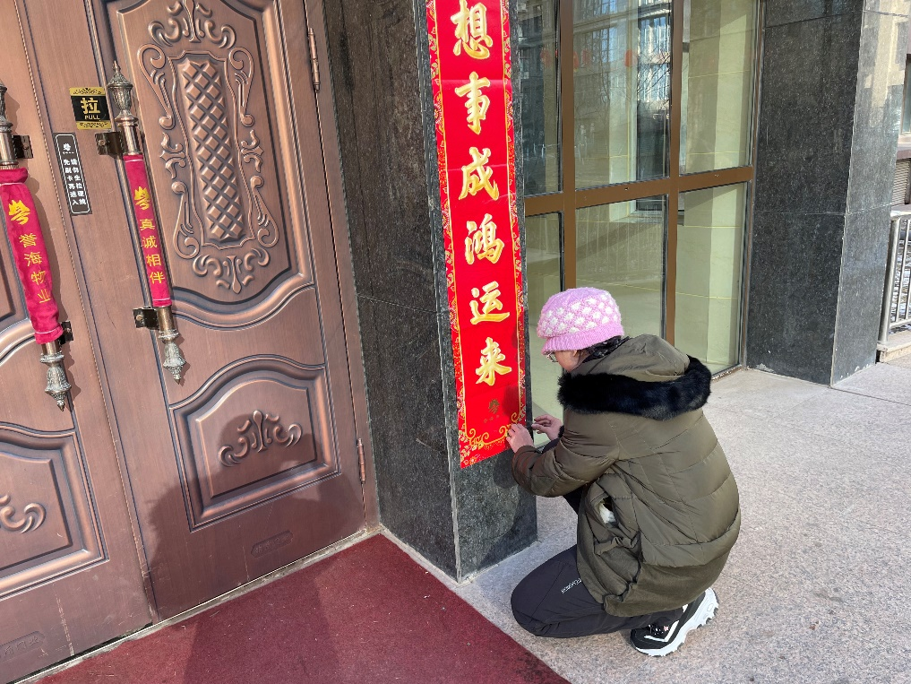 寒假来临,春节临近,贴上红彤彤的春联是见证新年最好的方式。腊月二十七,居委会召集辖区青年党员一起为所在区域的小区近十几个单元门开展“贴春联,迎新春”的活动。硕硕北风吹的大家不禁直打寒战,但看着贴好的春联和身边居民朋友对我们工作的赞不绝口的态度,我们心里暖洋洋的!