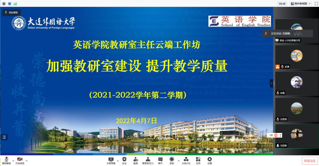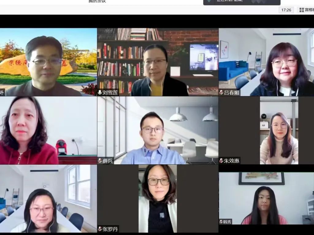 召开教研室主任云端工作坊,英语专业和商务英语专业教研室主任相聚线上会议室,围绕加强教研室建设、提升教学质量这一主题进行了经验分享和交流。工作坊由副院长曲涛主持,吕春媚院长出席。