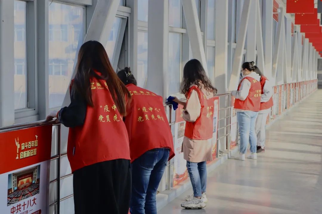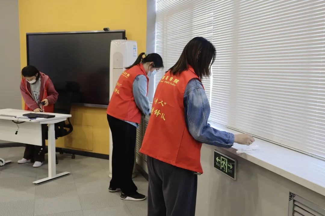 “疫中人”党员先锋队身先士卒、以身作则,开展了教室清扫工作。全体党员分别对VR实训中心、党史书屋、爱尔兰中心、党史长廊及各教室进行了清扫。