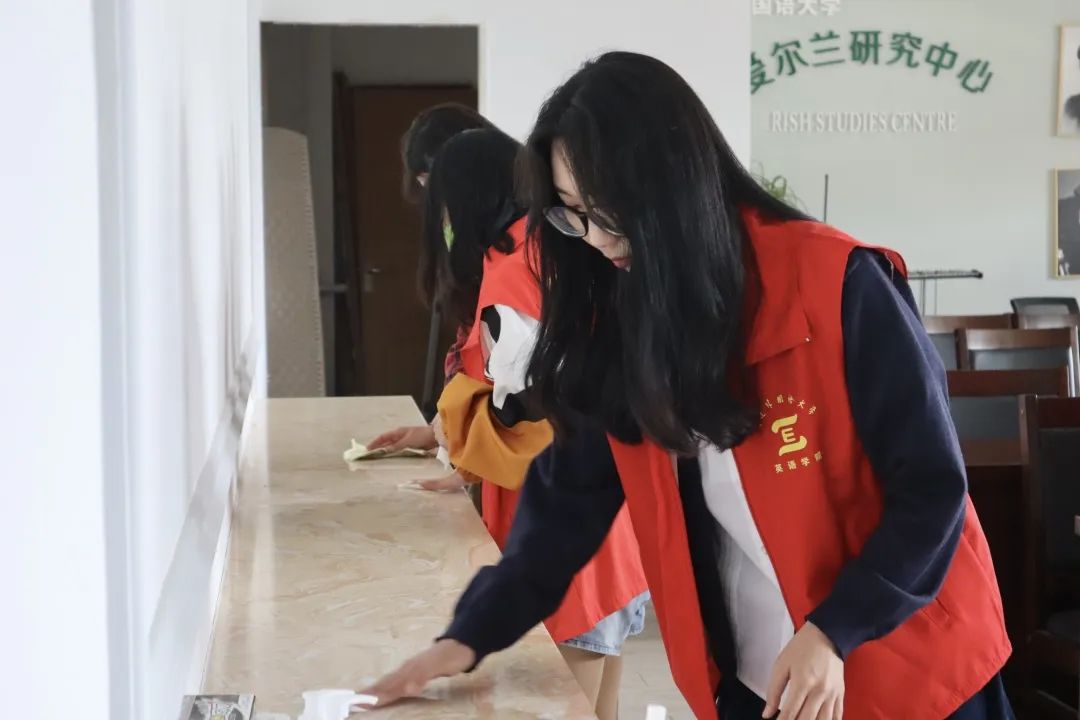 清扫工作中,党员们分工合作、互帮互助、热情四溢、斗志昂扬,充分发扬了党员先锋队“不怕脏、不怕苦、不怕累”的精神。本科生第一党支部的党员们仔仔细细地擦拭了党史书屋的书架和VR实训中心的桌椅窗台,并清理了盆栽枯死的枝叶;本科生第二党支部的党员们对爱尔兰中心的桌椅书架橱柜和党史长廊的扶手栏杆进行了清洁;研究生党支部的党员们则擦拭了各教室内部的书柜并将桌椅摆放整齐。