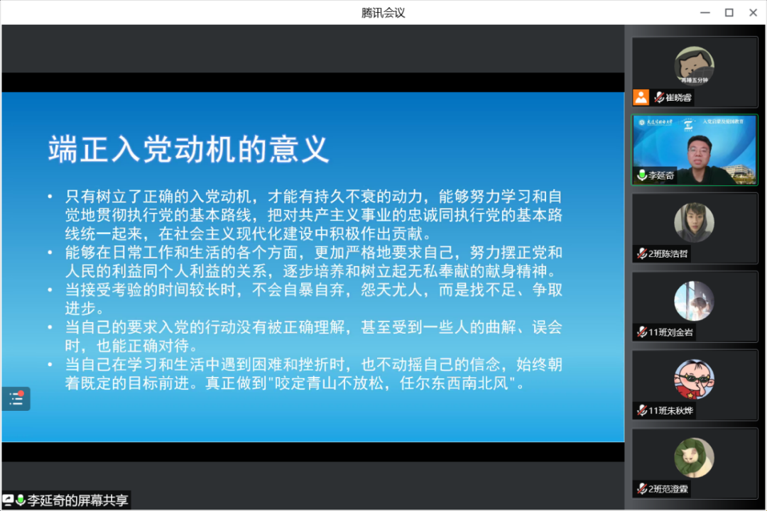 “青年走在时代的前列,是时代发展不可或缺的角色。”李延奇老师首先指出青年人需要正确站位,如今的伟大事业给青年的发展提供了无限可能。而后,李延奇老师播放了有关入党动机的视频,并从认识中国共产党、端正入党动机、入党流程三个部分对新生进行了入党启蒙教育。