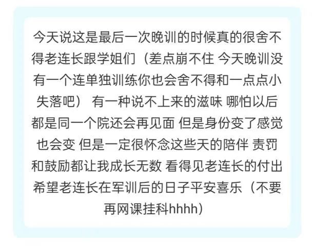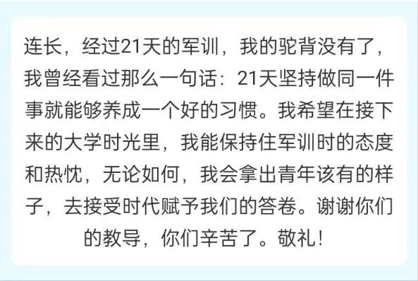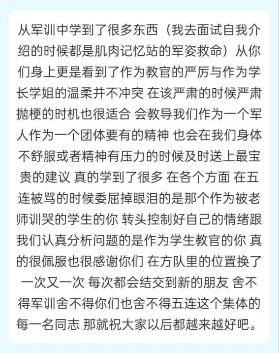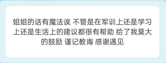 “军训期间,感念不期而遇的温暖,感谢可爱的班导师们,我们一同欢笑,一同前行。从起初的拘谨,至如今的熟络,是你们带我们走入大学,重启新篇;我们有幸遇见,有幸相识,我们的未来是共同的星辰大海。”