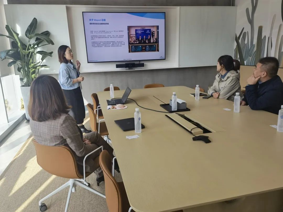 在参观了迈睿公司的办公环境后,双方开展了深入交流。王翠竹和董玉香介绍了公司的发展历程和发展战略,并且详细地列出了招聘岗位、招聘需求和薪资待遇等信息。王翠竹还表示,作为大外的毕业生,对母校的感情十分深厚,希望能够吸引更多的大外毕业生加入公司,助力公司发展。