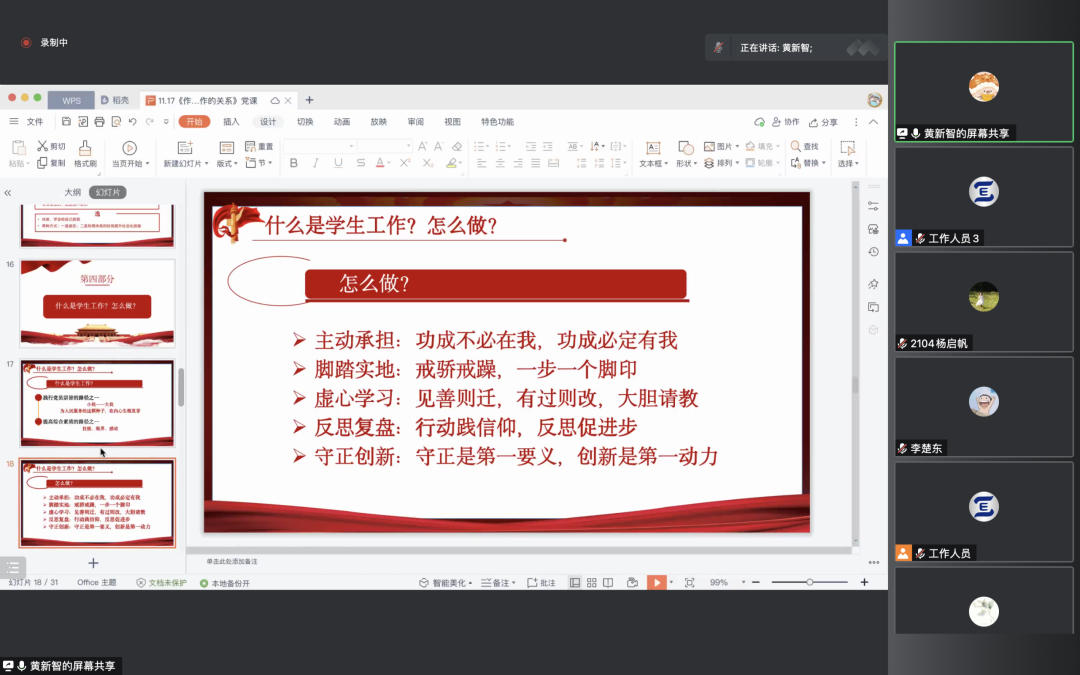 首先,曲镜达老师对“如何成为一名合格的共产党员”这一主题进行解读,并分享六个成为合格党员的方法。曲老师通过自身经历、党的事迹、党的故事和个人分析,详细解读了六个方法,帮助学员们明确自身定位,坚定入党决心。