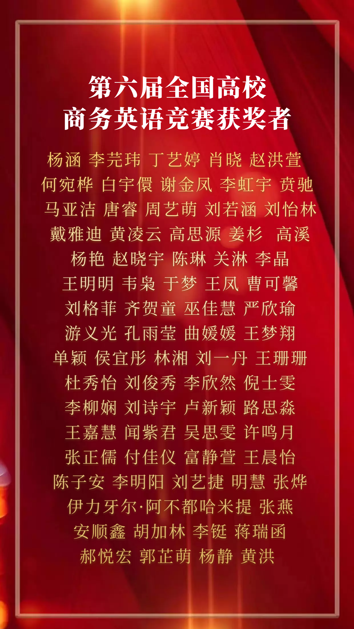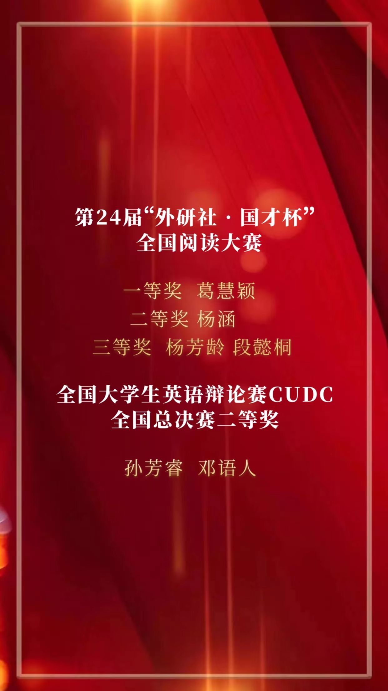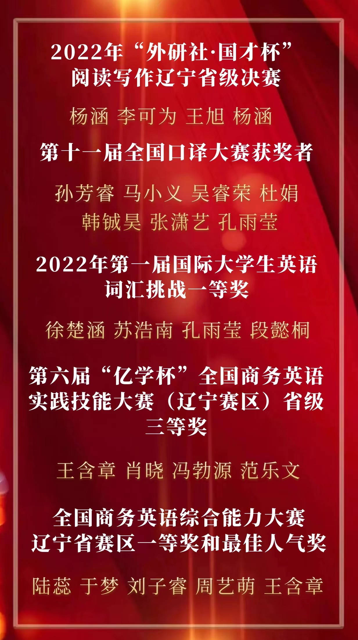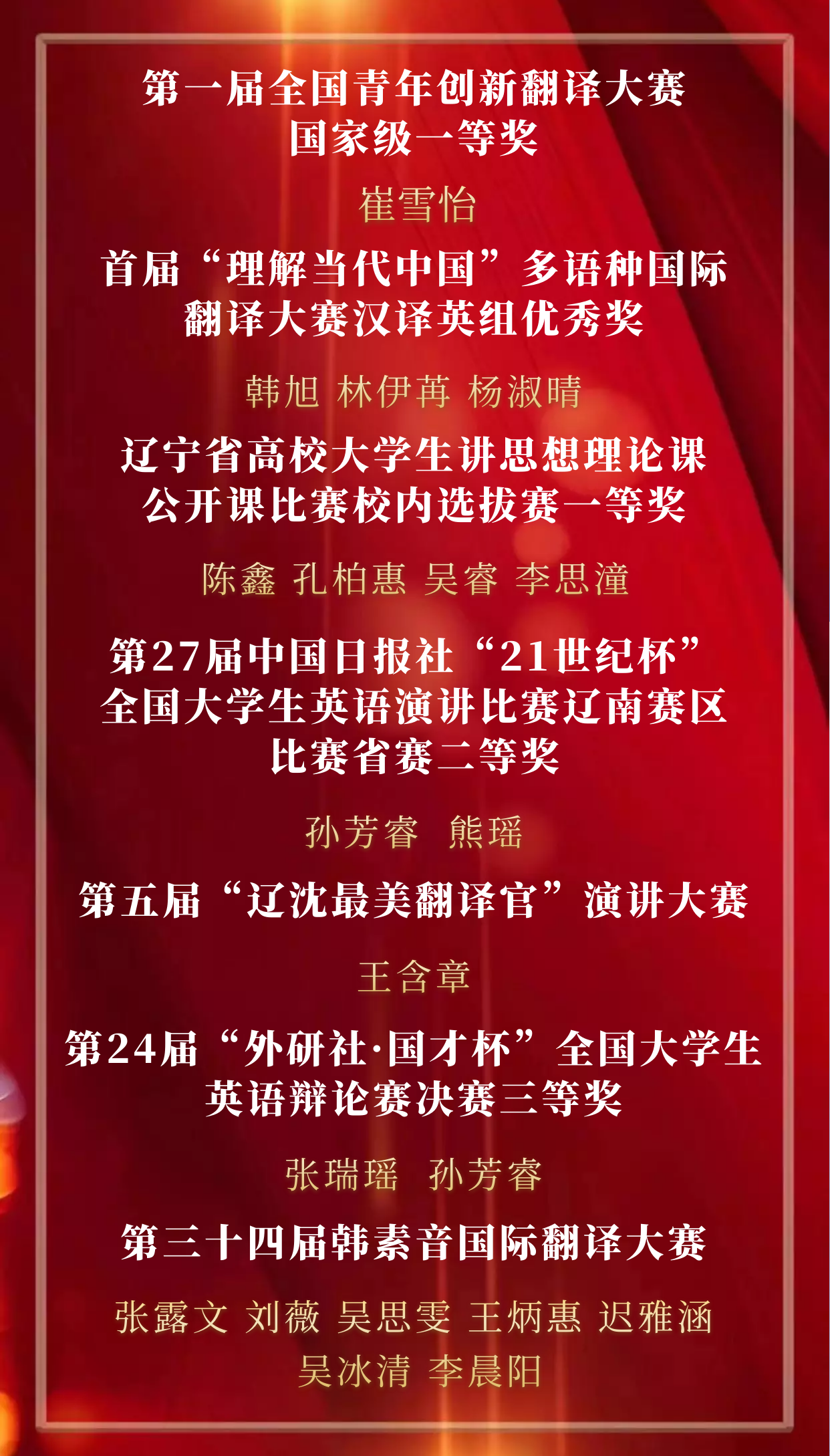 “青春榜样,荣耀英院”云颁奖典礼至此告一段落,让我们向上述获奖同学致以最诚挚的祝贺!韶华如驶,时光如掷,2022年即将结束,是同学们的孜孜不倦、刻苦奋斗,以及老师们的耐心教授、悉心指导才使他们能够获得这些荣誉。含英咀华,妙语生花;文修励学,与英笃行。眼有星辰大海,心有繁花似锦。2023年,我们定会不负心中所爱,奔赴下一场山海。(况彦萱 陈玥凝)