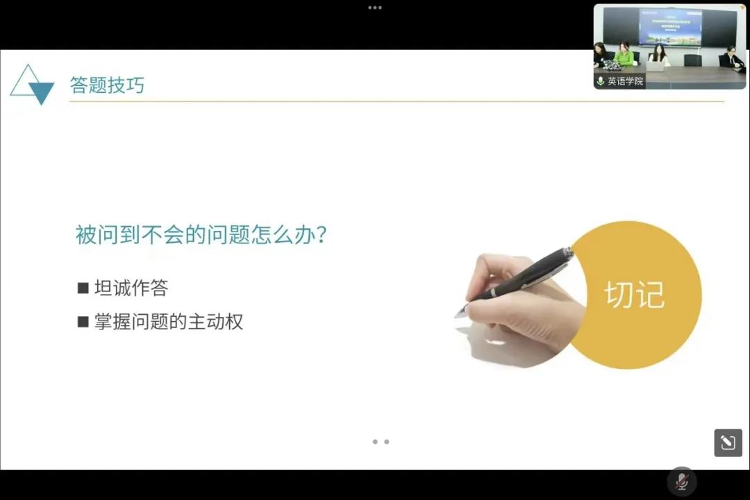 本次会议分为经验分享和答疑解惑两个环节。会议伊始,宋伟学姐向我们介绍了备考时需要注意的个人信息、学术生涯规划等方面,并以英语语言文学专业为例,对面试时所遇到的各类问题及应对方法做具体阐述。她向备考的各位同学建议要掌握问题的主动权,以平和冷静的心态面对接下来的复试。
