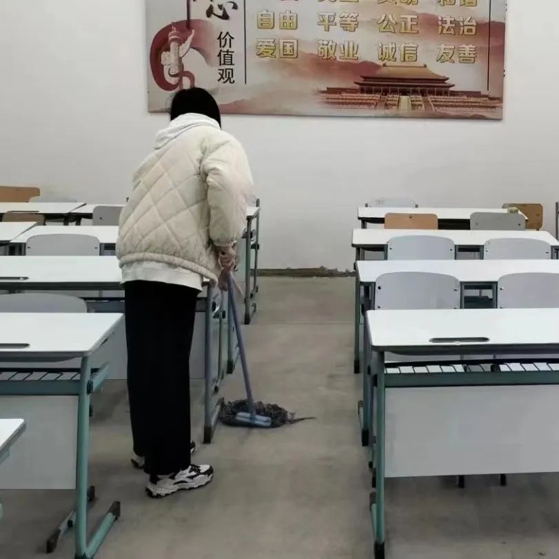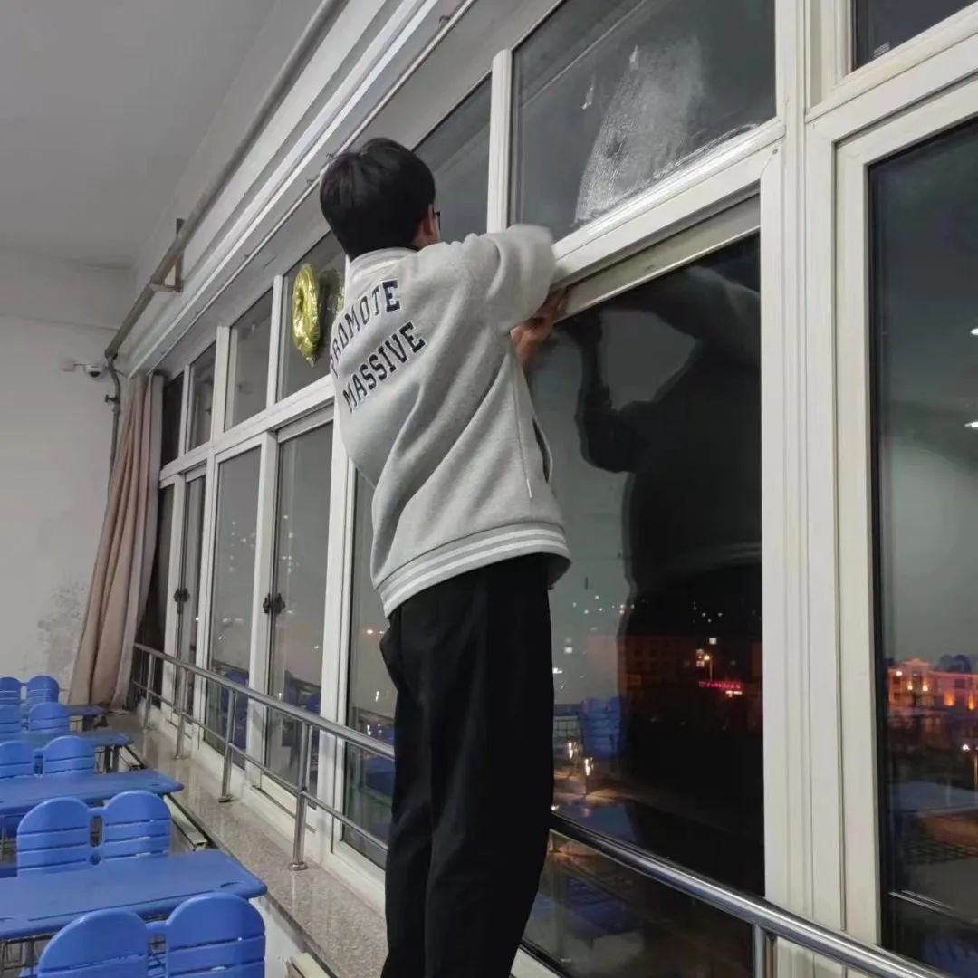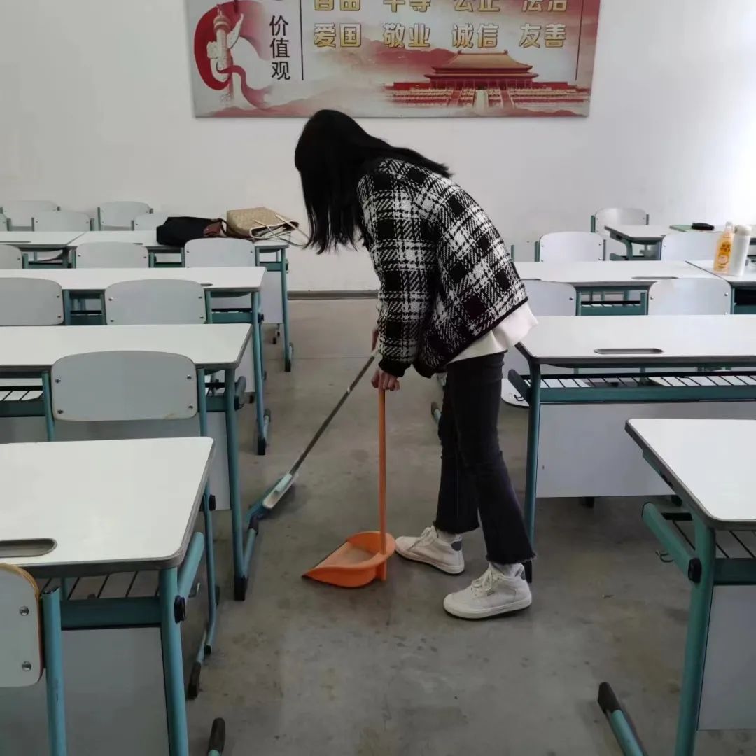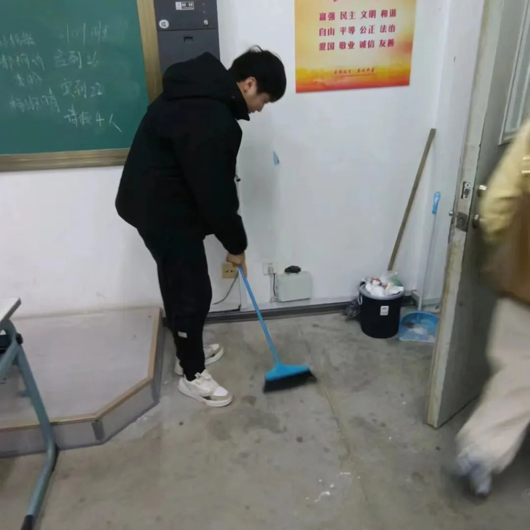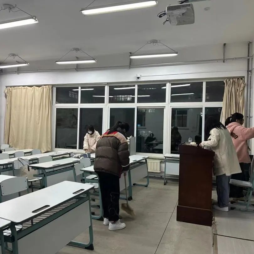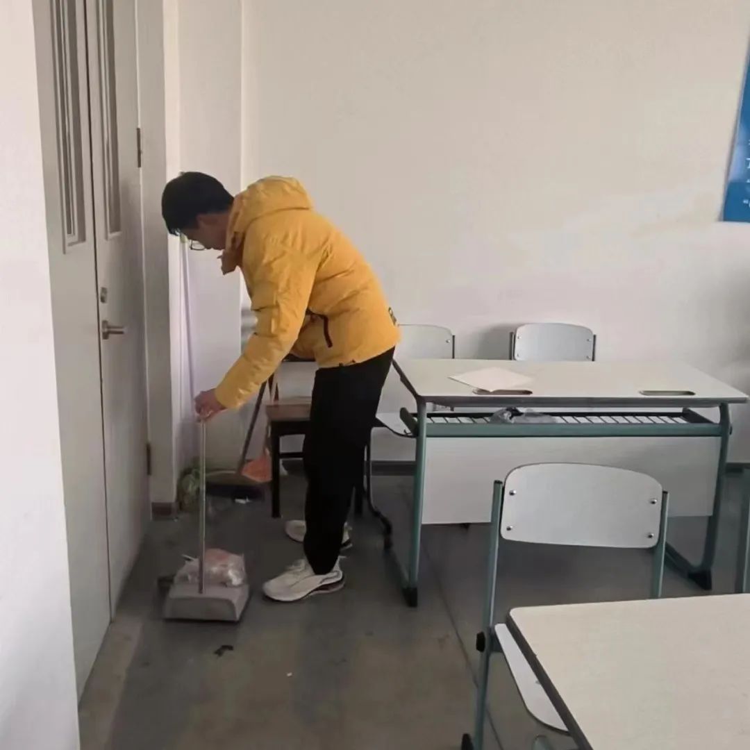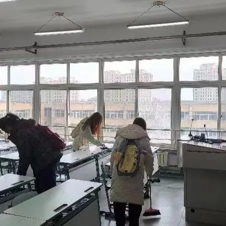 清扫工作中,同学们自带各种劳动工具,分工合作、互帮互助,仔仔细细地擦拭了教室的讲台与书柜,将桌椅摆放整齐,清理了盆栽枯死的枝叶,并对窗台门框进行了清洁,将教室的每一个角落都打扫得干干净净、一尘不染。在对待清扫工作一丝不苟、严谨认真的同时,同学们的热情和情绪也十分饱满、高涨,活力满满,斗志昂扬,用自身积极的劳动为同学们创造出一个窗明几净、明亮宜人的学习环境。
