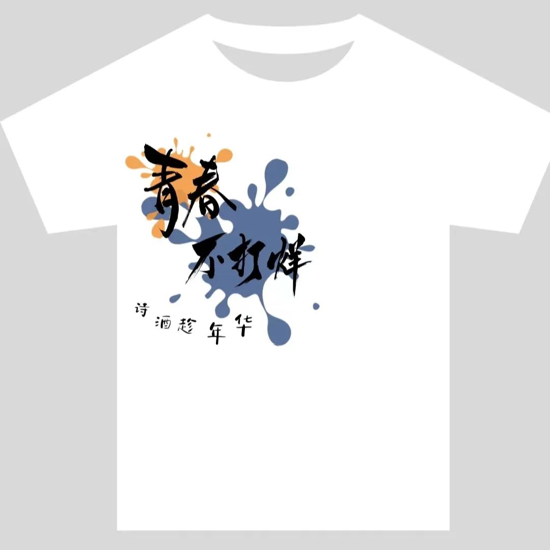 文化衫要素包括高山、飞鸟、学院logo,高山寓意学院学子无惧困难,勇攀高峰,袖子为学院主色蓝色,其橘黄色背景彰显出拼搏绚烂的青春基调。