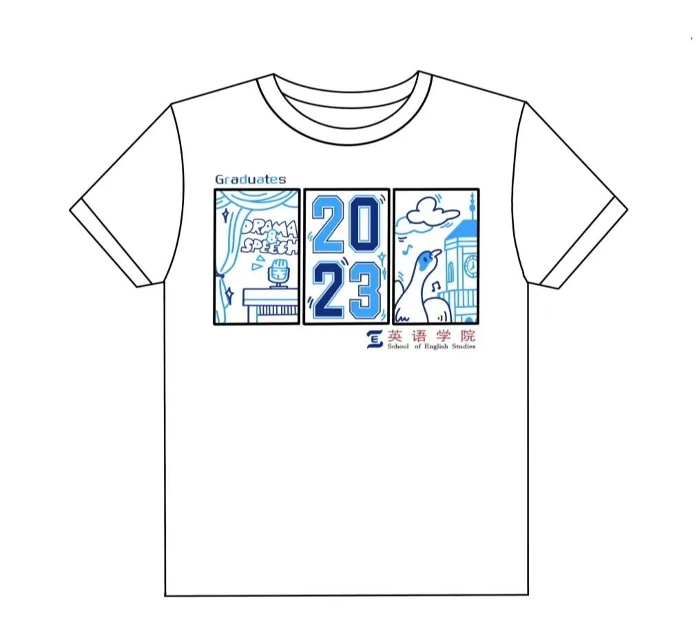学子不忘初心的同时,在未来拼搏于更广阔的蓝天。T恤的主要图案为漫画形式,包含非洲雁、钟楼等大外元素以及戏剧节、演讲比赛等英院专属元素,表现了对毕业生的美好期盼与祝福。