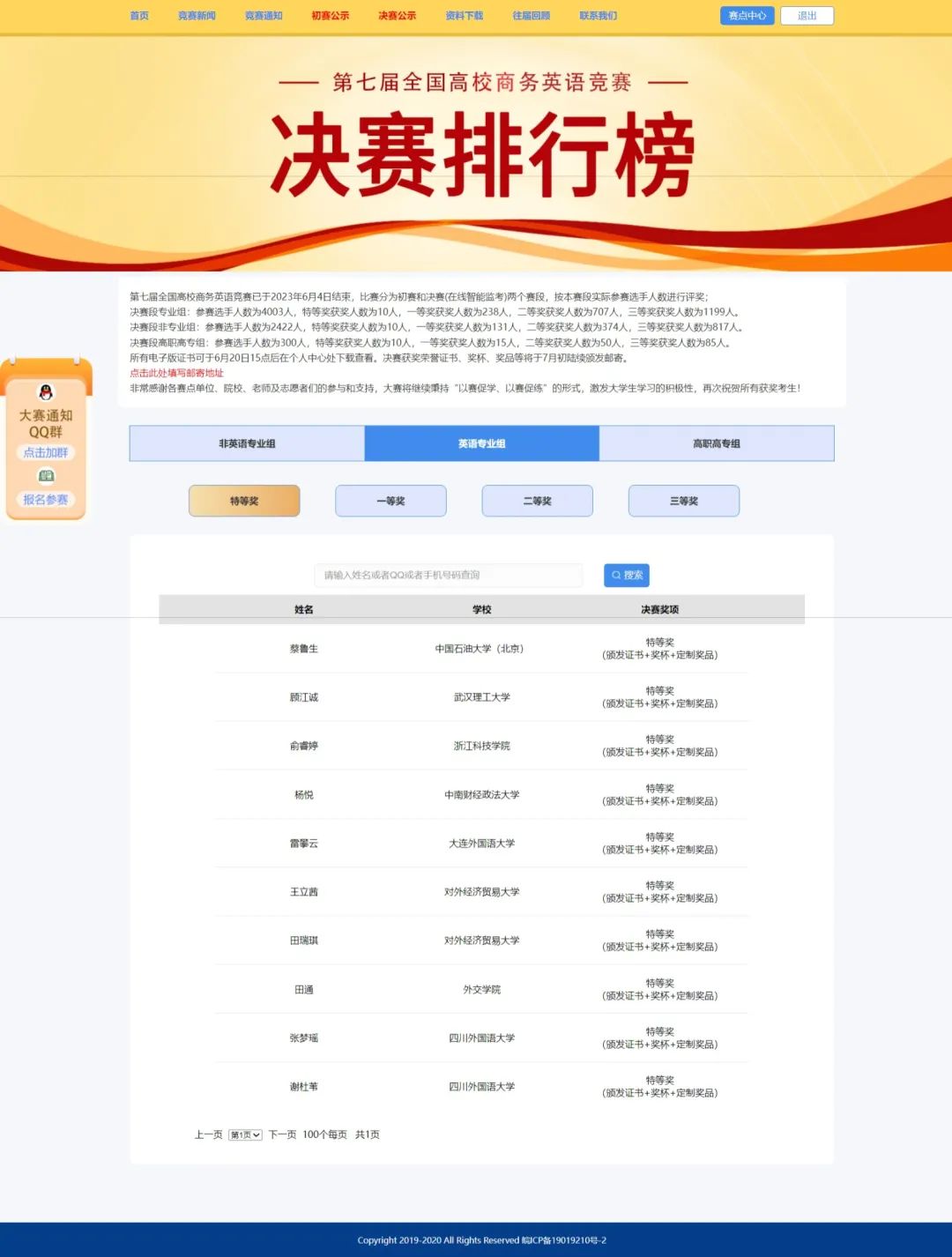 、四川外国语大学、中南财经政法大学等900余所院校的积极参与,近16000名选手参赛,其中英语专业组初赛9315人,决赛4003人。大赛设特等奖10人,竞争尤为激烈。