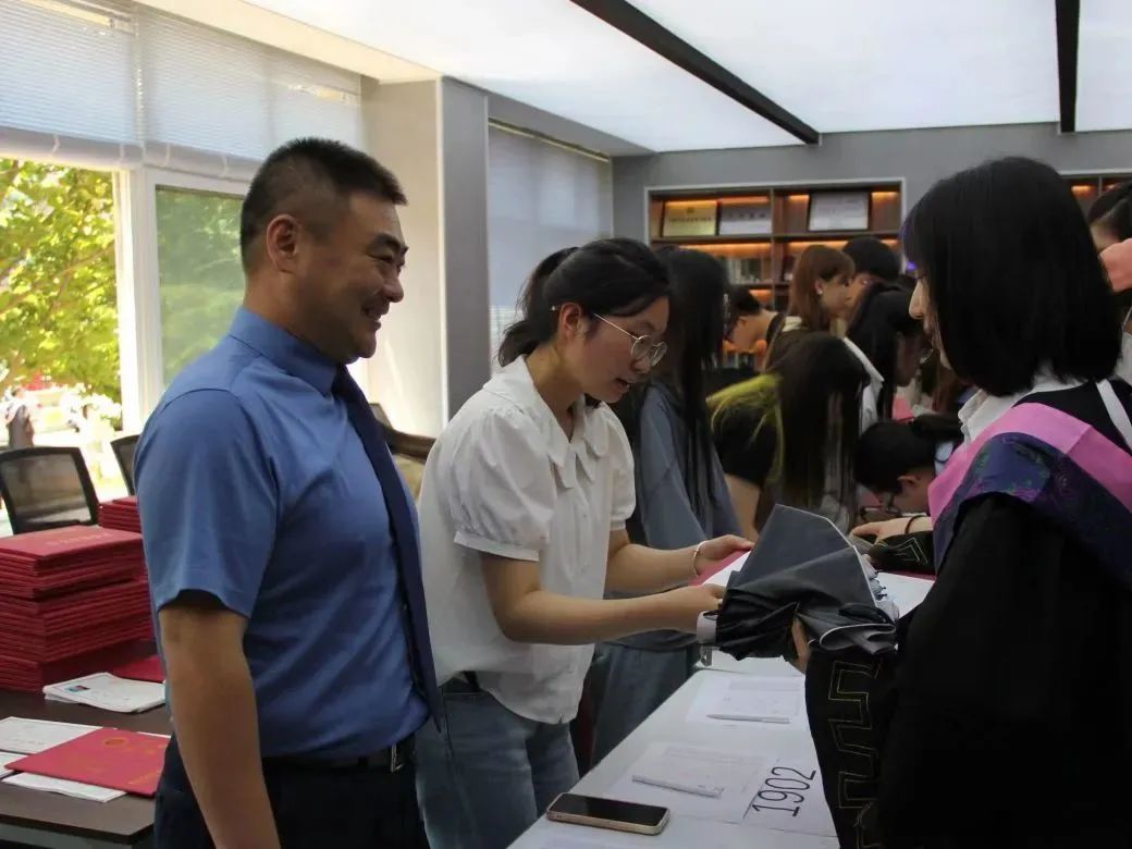 院长吕春媚、党委梁若冰副书记、党委副书记兼纪委书记孙硕、副院长曲涛、副院长刘晓晖、副院长王成东、硕士研究生导师孙鑫教授、王卉教授、2023届毕业生辅导员曲镜达及吴曼各位老师莅临现场前往祝贺,并与毕业生们拍照留念。看着曾经熟悉的面庞,老师和同学们纷纷湿了眼眶,感慨时光如梭。同学们在留言板上签下名字,似是为那段悄然而逝的时光画上最后的句号。
