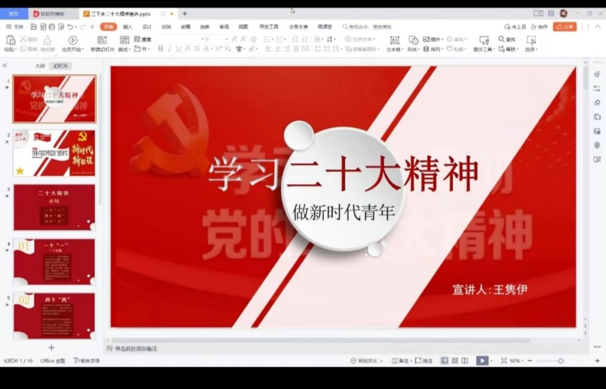 为在家乡盘锦市更好的传播党的二十大精神,传颂党的声音,同时让更多盘锦市人民了解新时代在党的二十大精神引领下家乡盘锦市的发展方向,我仔细研读党的二十大精神在辽宁省盘锦市地域的实际落实条款、认真查阅文件、反复观看主题系列新闻发布会,并以此为基础准备了相关内容的宣讲稿和宣讲PPT,在线上平台对盘锦市内社区内人员进行宣讲,充盈其精神世界,普及文化知识,让更多人感受到党的号召,为家乡建设付出切实努力。