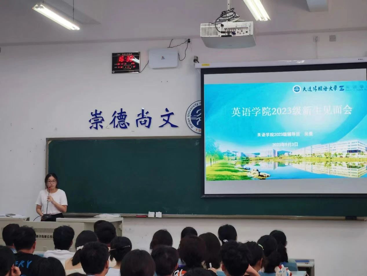 明德楼102教室,曲镜达老师首先向2023级1-6班新生进行自我介绍并讲述自身作为辅导员的工作职责,也对英日复语实验班进行了详细解读。曲老师还在侧重讲解了学校的有关规章制度的同时,强调了新生军训的重要意义。接下来,曲镜达老师从学习、生活等多个方面为同学们未来四年的生活提出了宝贵建议,鼓励同学们努力成为综合全面的复合型人才。