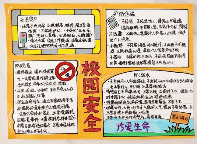 这次比赛不仅让同学们增长了知识,提高了安全意识,也展示出了大家对安全教育的热情和创造力。通过手抄报的形式,同学们将理论知识与现实生活相结合,让安全教育更加鲜活、形象,更能引起广大师生的关注。最后,再次恭喜获奖的同学们!希望大家能够以此为契机,更加注重安全教育,切实保障自己和他人的安全。(王喆)