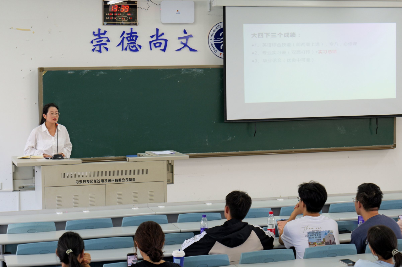 会议伊始,王艺凝老师向同学们介绍了大四下学期学业安排概况,明确了正式进入就业阶段前应重点关注的主要问题。随后,王艺凝老师讲述了主要就业类型,并从升学、就业、创业等几个角度切入,为同学们提出建议。