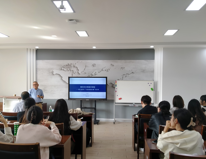 邀请,为我院师生做了题为“城市社区的语言表征——基于北京市‘月亮河休闲小镇’的分析”的学术讲座。讲座由学院副院长王成东主持,符号学团队部分教师、硕士研究生共同聆听了此次讲座。