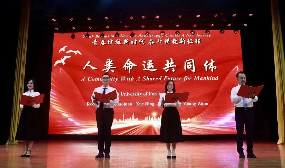 师生代表为大家朗诵《人类命运共同体》。他们通过朗诵将实现人类命运共同体的期盼和热情体现得淋漓尽致,呼吁各国同舟共济、携手建设更加美好的世界。