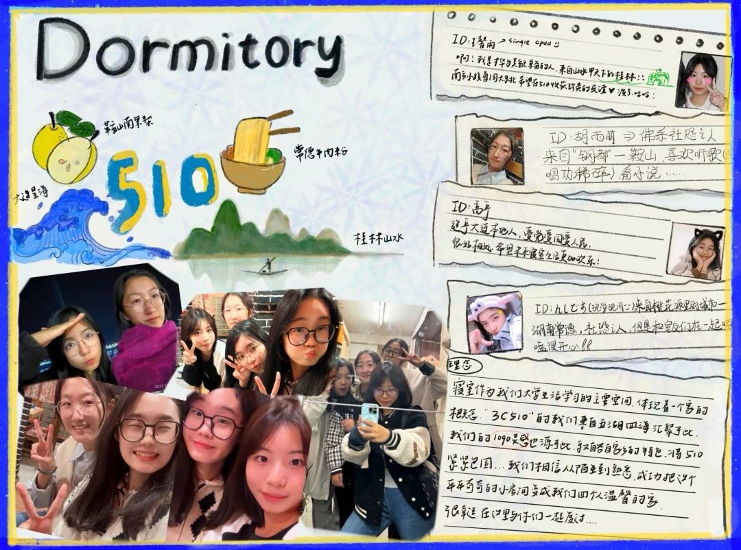举办了“‘宿’说青春,‘E’见钟‘寝’”寝室文化节。本次活动以寝室为单位开展,包含寝室门DIY、我们的宿舍故事、寝室名片设计三个活动。在评选的过程中,一份份温馨活泼,明亮清雅,同时又展现了成员个性特点的作品脱颖而出。接下来,就让我们从获奖作品中领略各个寝室的风采吧!