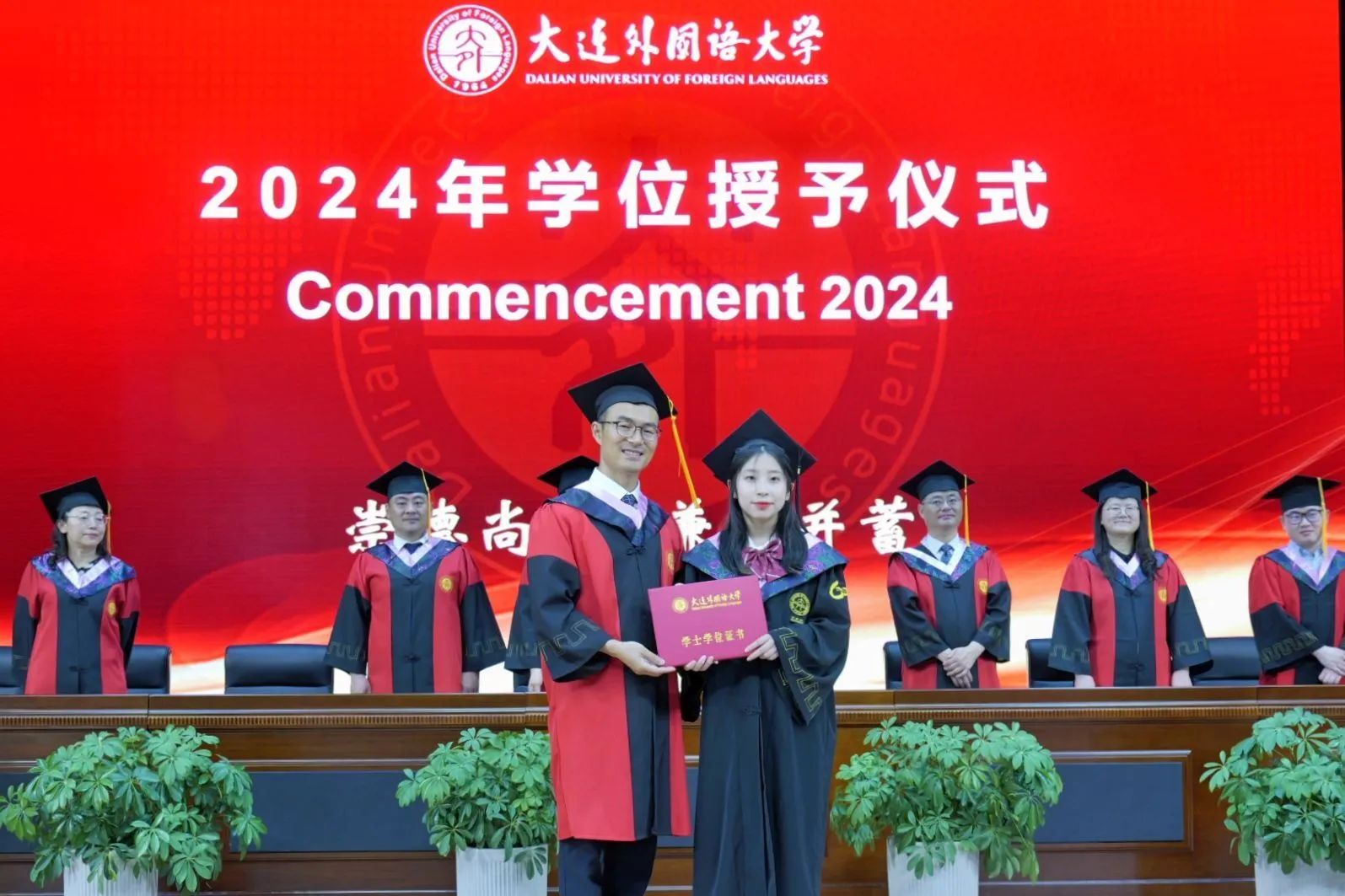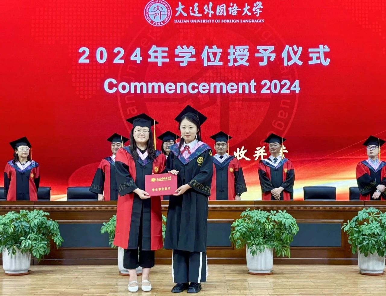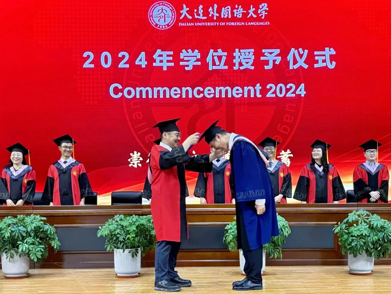 学位评定分委员会的老师们为每一位毕业生颁发学位证书,毕业生们身着学位服依次走上舞台接受了“一对一”的拨穗仪式。接过学位证书的时刻,毕业生们深深鞠躬,表达对老师真挚的感激与爱戴,老师们也对毕业生的学业表现予以充分肯定和赞许,并对他们的未来予以美好祝愿。