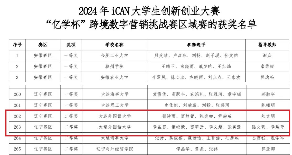 陆文玥、李延奇老师的指导下,由商务英语专业李孟容、郭诗雨带领的两支参赛队伍积极报名,认真备赛,最终均获得辽宁赛区二等奖。