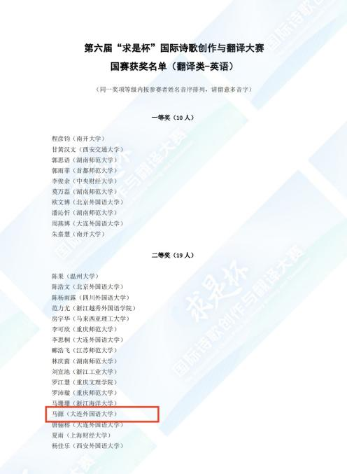 王春、于雪两位老师的悉心指导下,马源同学历经激烈角逐,最终荣获国赛翻译类二等奖。
