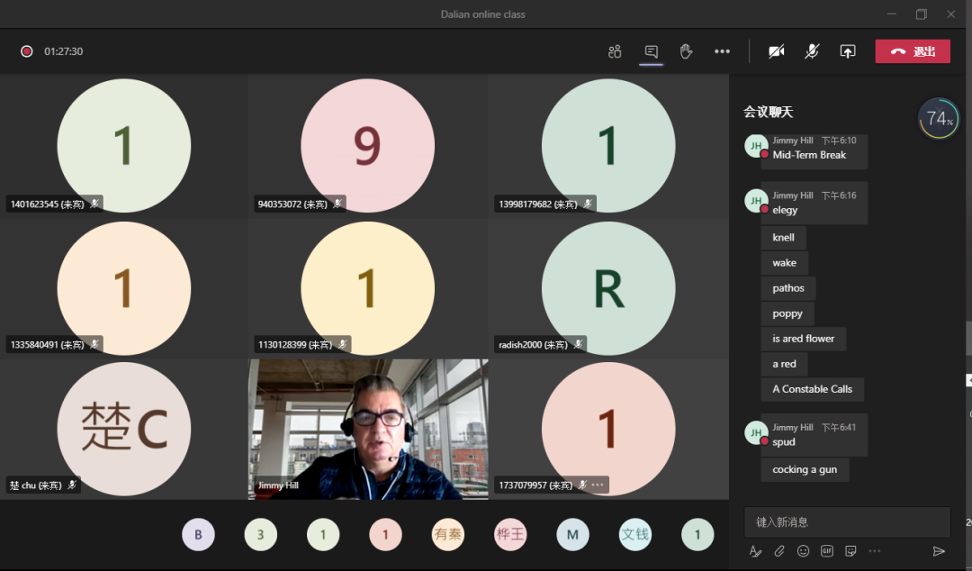 2020年10月19日至10月23日,爱尔兰国家学院副校长Jimmy Hill教授为2018级英语专业本科生讲授《爱尔兰诗歌》课程。本次课程共计17课时,采用爱尔兰国家学院线上系统授课。整个课程内涵丰富、形式多样,大大加深了学生们对诗歌的理解及对爱尔兰的认识,拓展了学生们的国际视野及人文思维。