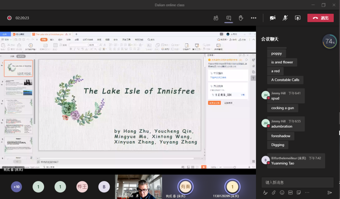 Jimmy教授通过主题、意象以及象征手法探讨爱尔兰现代诗歌,主要围绕叶芝(William Butler Yeats)、卡瓦纳(Patrick Kavanagh)和希尼(Seamus Heaney)三位著名诗人的作品展开讲解,不但让学生了解什么是诗歌,何为现代诗歌,如何阐释诗歌,而且鼓励学生多维思考,积极互动,享受诗歌本身。课堂上,Jimmy教授时常带领学生一起朗读诗歌、欣赏由诗歌改编的歌曲和学习诗歌选集,结合丰富多元的代表性图片引导学生深度了解爱尔兰社会、政治、历史和文化,让学生深切体悟爱尔兰诗歌富含的思想与精神。Jimmy教授对诗歌的热爱及其渊博的学识使学生颇受感染,他们积极投入课堂活动,紧跟教授思路,大胆发表见解。在最后一堂课上,学生们以小组的形式展示了对诗歌The lake Isle of Innisfree的深度理解,其独特的见解和流利的口语让屏幕另一端的Jimmy教授颇为赞赏,给与高度肯定。