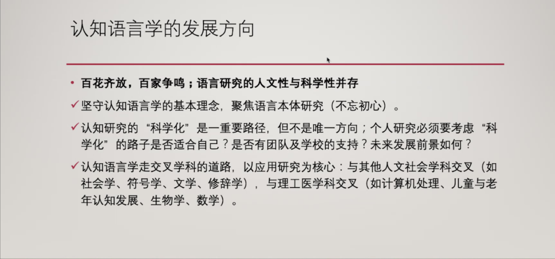 王军教授从认知语言学的基本理念、研究对象范围、研究“科学性”问题以及未来发展方向四个方面对语言认知研究的“科学化”道路发展进行了梳理和分析。