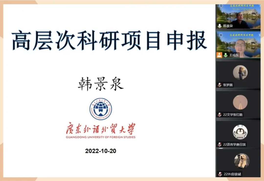 邀请,通过腾讯会议平台为我院师生做了题为“高层次科研项目申报”的学术讲座。本次讲座为我院“外语学科融合发展”高端云讲坛系列讲座之一,由副院长王成东主持,我院部分教师及硕士研究生共同聆听了此次讲座。