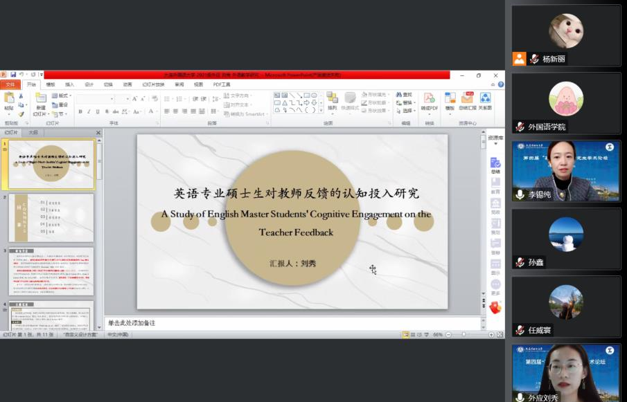在接下来的分论坛中,主持人有序组织和安排论文宣读,与会研究生们就外国语言与文学领域前沿问题,详尽汇报了自己的研究成果。三位点评专家就每位同学的研究选题、框架思路、方法选择、理论运用等方面进行了深入到位的点评,并对如何进一步提升论文质量提出了合理化建议,展现出严谨的学术精神和深厚的学术修养。现场交流气氛热烈,在相互对话与交流中,在智慧碰撞与交融中,青年学子们相聚“云端”,互学互鉴、共同进步、共同成长。