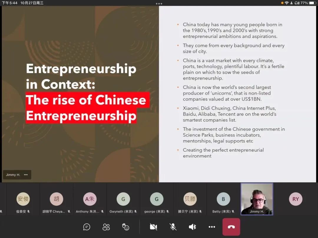 国际交流与合作,深化课程国际化建设,拓展学生的国际视野,培养学生的创业精神和创新意识,我院邀请爱尔兰国家学院副校长Jimmy Hill教授于10月19日至11月2日为商务英语专业本科生讲授《创业导论》课程,全程采用线上方式授课。