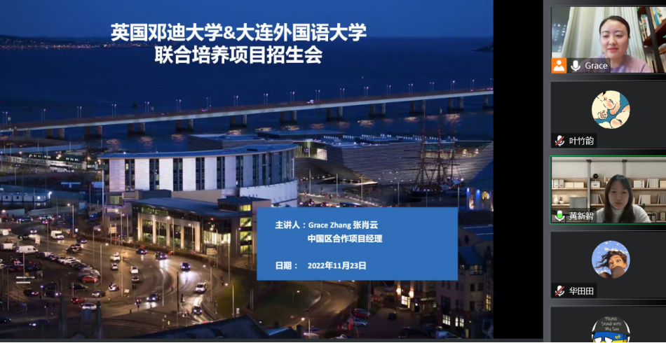 于11月23日邀请英国邓迪大学中国区项目负责人张肖云女士进行了留学项目线上宣讲会。本次宣讲会由学院留学工作外事秘书黄新智老师主持,对留学项目感兴趣的本科生和研究生参加了此次宣讲会。