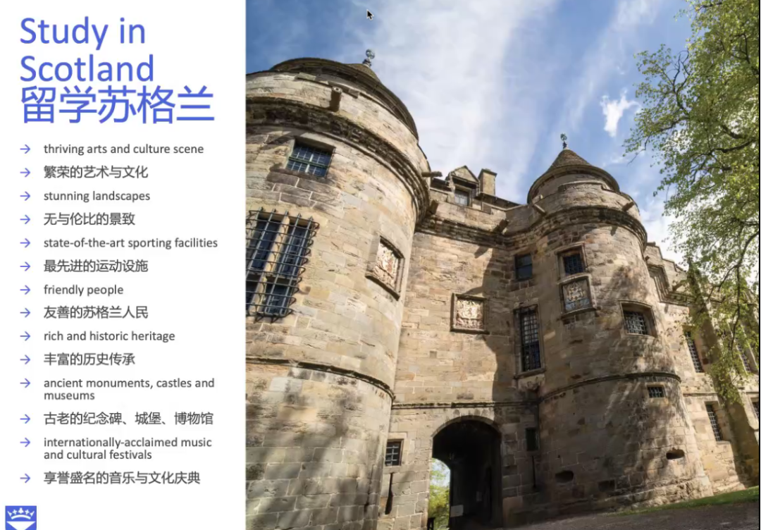 与英国邓迪大学联合培养项目,包括本科阶段的2+2项目和3+1+1项目及硕士阶段的4+1项目和1+1+1项目,张女士还就联合培养项目的申请要求和相关流程进行了详细说明。随后,张女士从师资队伍、专业设置、研究平台、院校合作等多个方面介绍了邓迪大学,并通过播放学校的宣传片向同学们展示了学校浓厚的学习氛围、优美的周边环境及强大的科研实力。最后,张女士与同学们进行了互动交流,回答了大家共同关注的问题。
