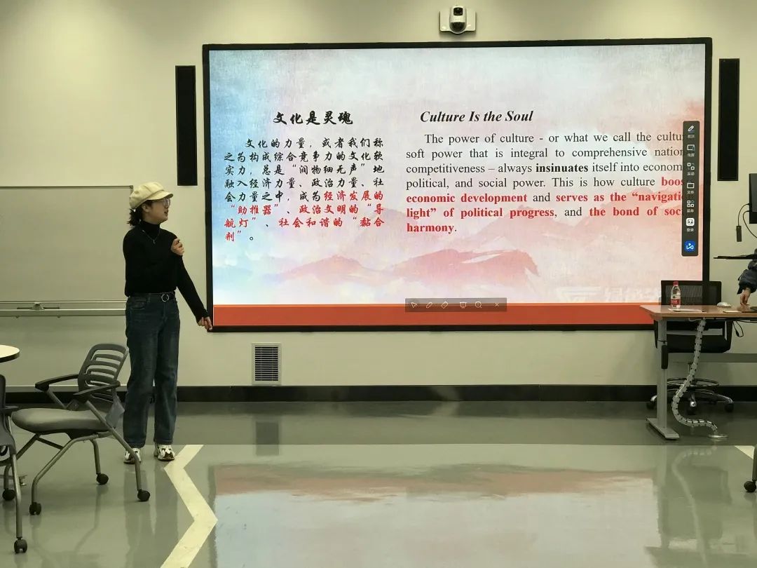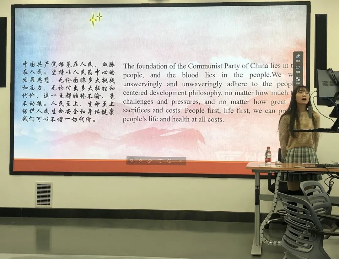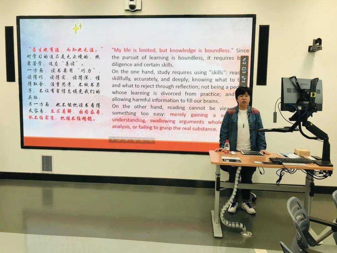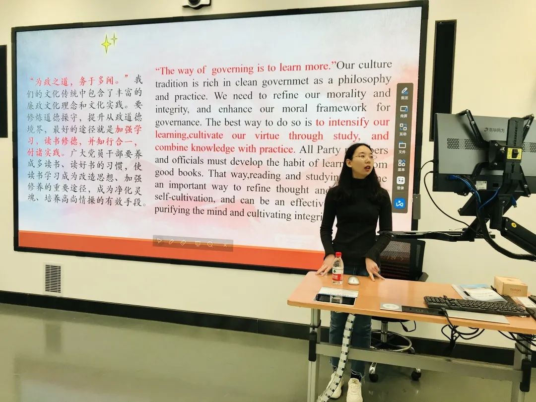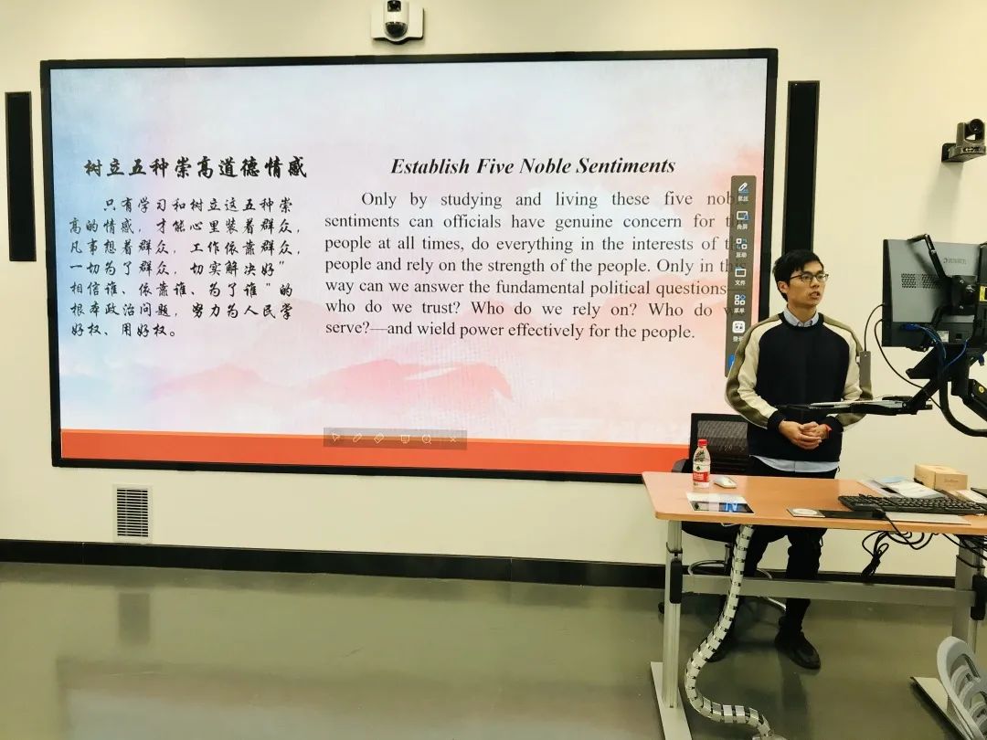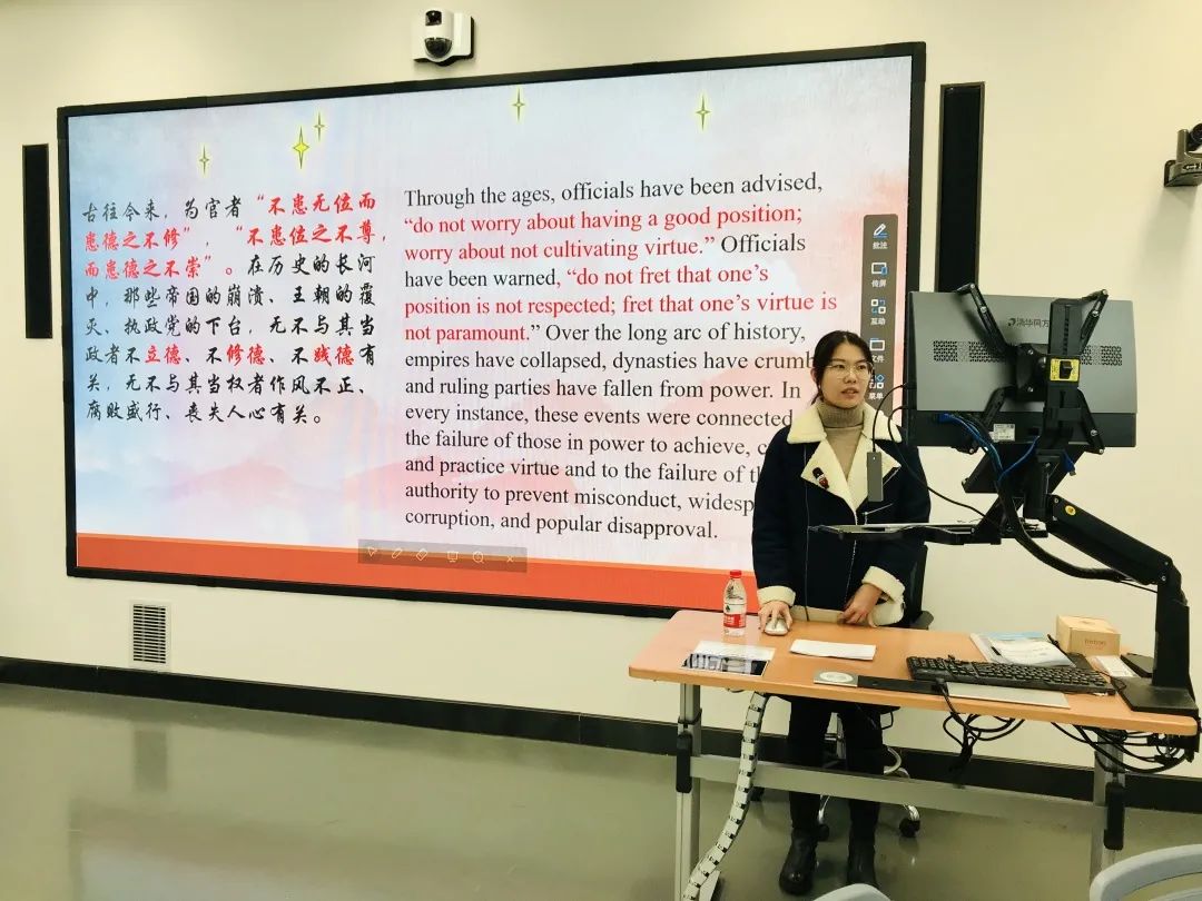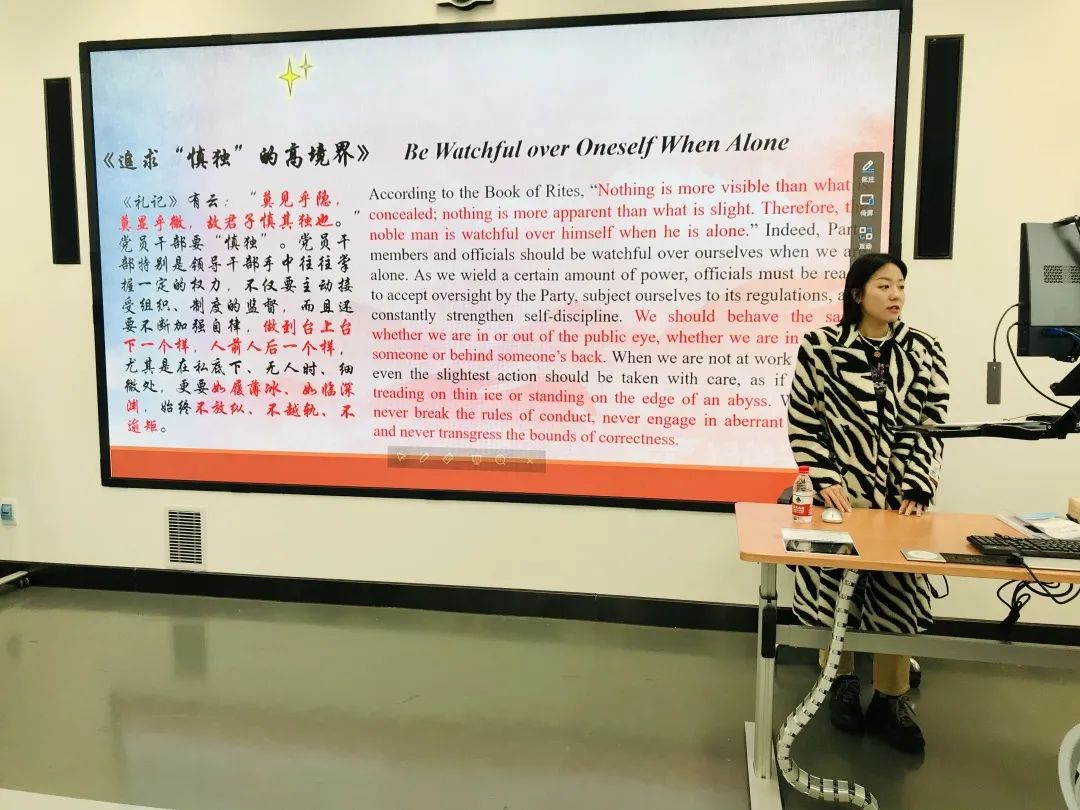本次诵读内容包括“文化是灵魂”“做人做事力戒浮躁”“做人与做官”“理论学习的三种境界”“读书修德,知行合一”“以人为本”“追求慎独的高境界”等。同学们依次用中英双语进行朗诵,同时结合选段与个人经验分享自己的心得与感悟。接下来由梁书记对本次活动进行总结发言。