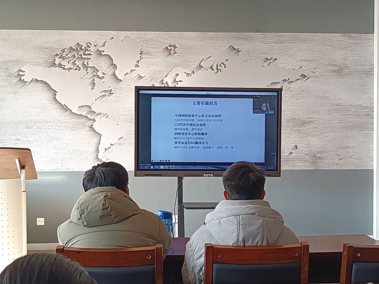 分享会伊始,王欣阳同学和李可为同学通过线上方式分别讲述了自己的口译学习和实践经历,为现场的同学们提出了多条实用的建议,同时鼓励同学们通过不断的学习来更加了解这个世界。