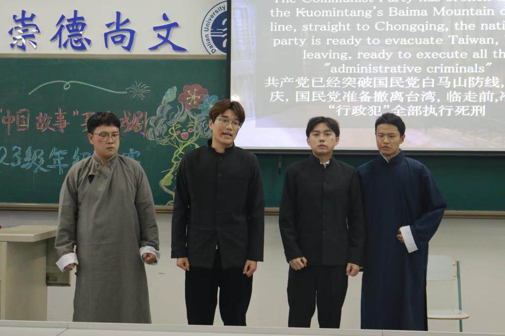 2023级1班为大家呈现的经典剧目《茶馆》节选片段拉开了505室比赛的帷幕,他们以茶馆为中心,演绎了旧社会里不同人物的悲惨遭遇,深刻地揭露了黑暗的旧社会本质。